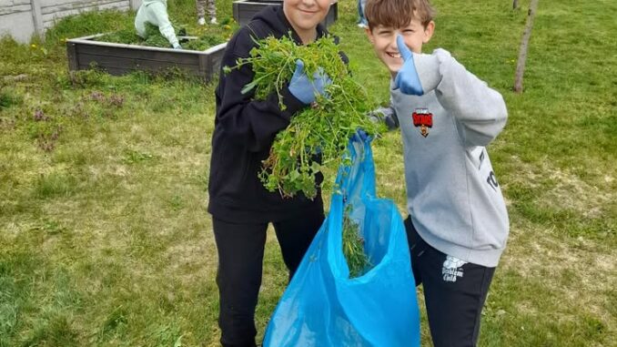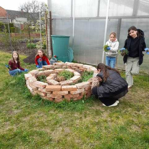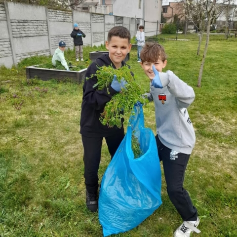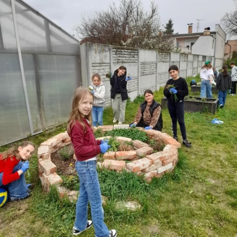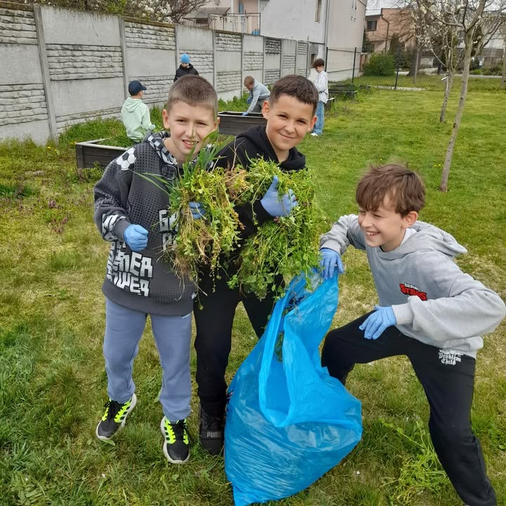 fotografie, ako si tretiaci a štvrtáci zveľaďujú okolie svojej školy a